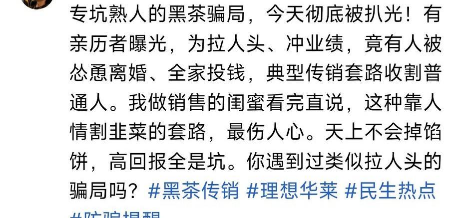 "兩萬(wàn)八買茶葉就能暴富?記者臥底揭露'理想華萊'黑茶騙局:扣身份證、斷信號(hào)、洗腦話術(shù),用直銷牌照掛羊頭賣狗肉。想回本就得拉人頭,十個(gè)代理九個(gè)離婚,這種'財(cái)富自由'代價(jià)太沉重。"