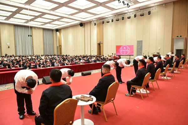 在莊嚴(yán)肅穆的“拜師立約”儀式中,一線業(yè)務(wù)的新晉師徒代表按照古禮,完成凈手、正衣、敬茶、授巾、共誓等環(huán)節(jié)。一杯清茶,一份誓詞,不僅定格了師徒攜手前行的初心,更彰顯了雙匯人對(duì)經(jīng)驗(yàn)分享與文化傳承的鄭重承諾。