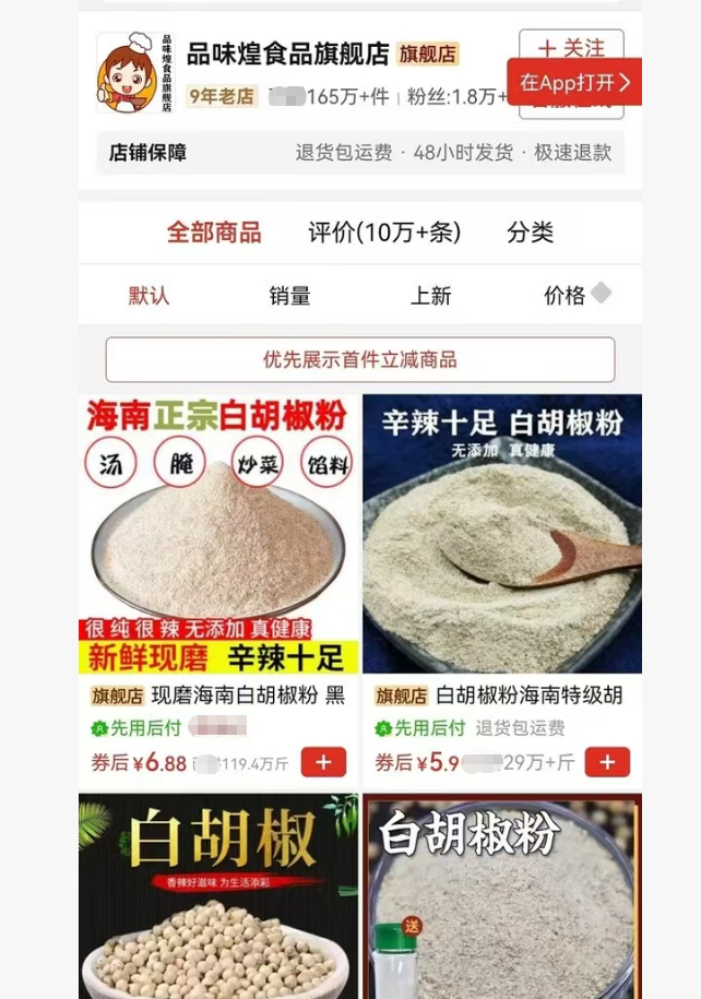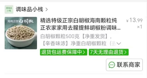 11月15日,記者通過某電商平臺“品味煌食品旗艦店”購買了一款現(xiàn)磨海南白胡椒粉(甄選優(yōu)質),售價為14.31元/斤。咨詢客服產(chǎn)品有無檢測報告、合格證時,其快速回復“沒有”,被問詢有無其它添加,其反復強調“正宗的白胡椒粉,你不喜歡可以退貨”。值得注意的是,財政部、國家稅務總局印發(fā)的《農(nóng)業(yè)產(chǎn)品征稅范圍注釋》明確:胡椒雖屬于“植物類”下的園藝植物,歸為初級農(nóng)產(chǎn)品,但同時規(guī)定“碾磨后的園藝植物(如胡椒粉、花椒粉等)不屬于本貨物的征稅范圍”。白胡椒粉不符合初級農(nóng)產(chǎn)品的界定,但該產(chǎn)品外包裝卻打著“初級農(nóng)產(chǎn)品”標識,以此來“躲避”標注SC生產(chǎn)許可證信息及生產(chǎn)企業(yè)信息的義務,僅標注銷售商信息“東莞市樂淘千味食品批發(fā)部”。據(jù)查,該味煌食品旗艦店由東莞市德帆電子商務有限公司運營。