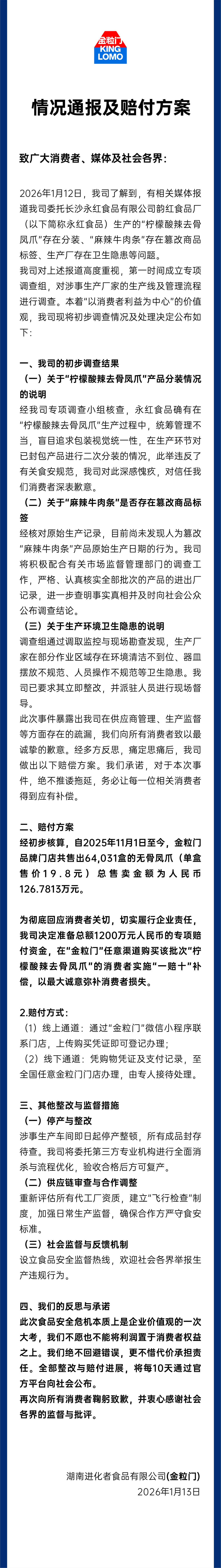 金粒門發(fā)布情況通報:設立1200萬專項賠付資金,對在“金粒門”任意渠道購買該批次“檸檬酸辣去骨鳳爪”的消費者實施“一賠十”補償