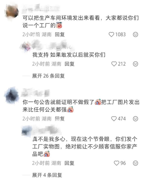 該公開信發(fā)布后,在評論區(qū)引發(fā)熱議。部分網(wǎng)友對幾多全的表態(tài)持審慎態(tài)度,留言提出“可以把生產(chǎn)車間發(fā)出來看看,大家都說你們是一個工廠的”“你一句公告就能證明不作假了,把工廠圖片發(fā)出來比任何公關(guān)都強”等質(zhì)疑;更有網(wǎng)友直接反饋在幾多全產(chǎn)品中吃到疑似異物,表達了對產(chǎn)品質(zhì)量的擔憂。