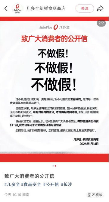 近日,某鮮食零食品牌被曝食品安全問題,引起網(wǎng)友熱議。在此背景下,鮮食零售品牌“幾多全”于1月14日通過社交平臺發(fā)布《致廣大消費者的公開信》,鄭重承諾“不做假”,并表示食品安全是企業(yè)“不可挑戰(zhàn)的生存底線”,呼吁消費者共同監(jiān)督。