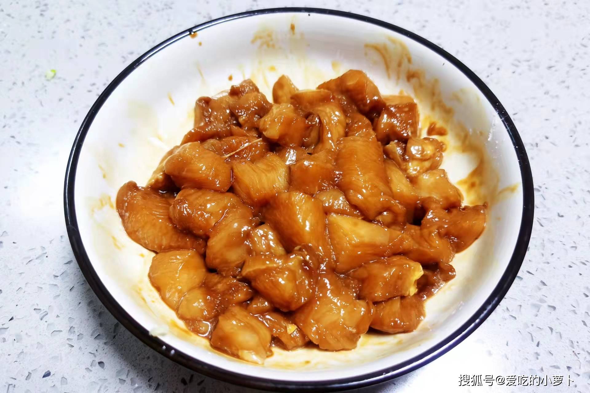第二步:接著取一空碗,將切好的雞胸肉放入空碗中,再加入一勺料酒、一勺生抽、一勺蠔油、半勺老抽、半勺食用油和兩勺淀粉,然后抓拌均勻,腌制大約20分鐘左右,備用。