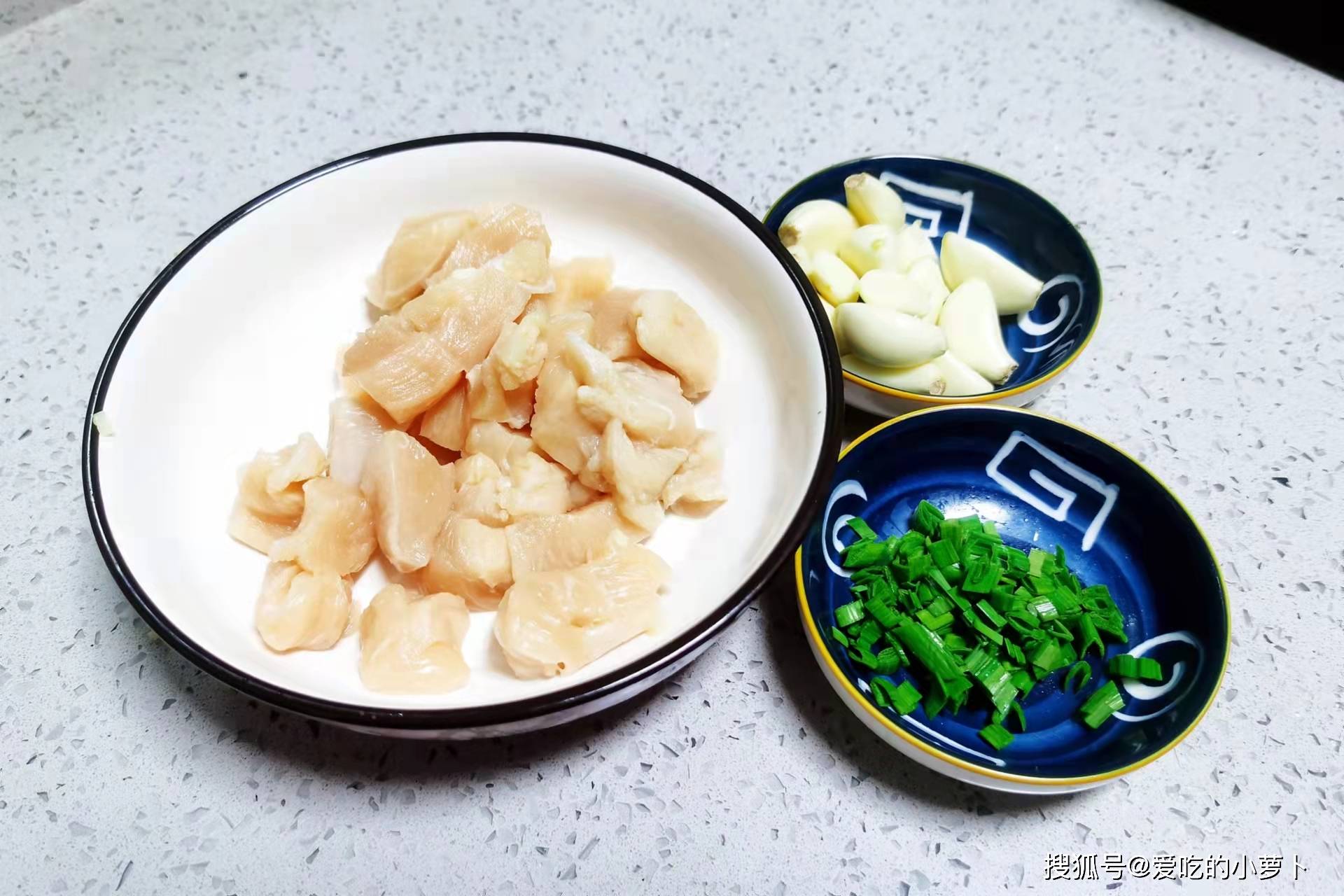 第一步:先將買來的雞胸肉改刀切小塊,再將大蒜去皮,小蔥清洗干凈,改刀切蔥花,然后將切好的食材裝入盤中,備用。