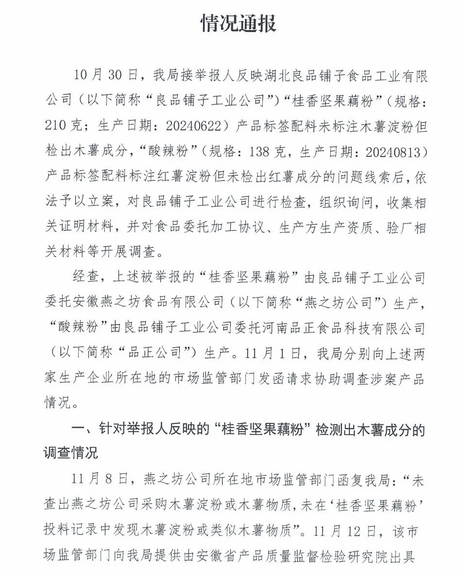據(jù)“金銀湖畔”微信公眾號(hào)消息,武漢東西湖區(qū)市場(chǎng)監(jiān)管局發(fā)布情況通報(bào)。通報(bào)中提到,舉報(bào)人反映的良品鋪?zhàn)庸I(yè)公司涉嫌委托生產(chǎn)的“‘桂香堅(jiān)果藕粉’檢測(cè)出木薯成分”,“‘酸辣粉’未檢測(cè)出紅薯成分”的問題并不成立。