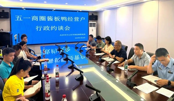 7月24日下午,天心區(qū)市場監(jiān)管局結(jié)合制售假劣肉制品專項整治行動工作,聯(lián)合坡子街街道辦事處、五一商圈管委會對商圈內(nèi)117家醬板鴨經(jīng)營主體共76個法定代表人(負責人)進行集體行政約談。