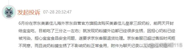 黑貓投訴平臺上,一位消費者投訴,2022年6月份在京東美素佳兒海外京東自營官方旗艦店購買美素佳兒皇家三段奶粉,吃了三分之一左右發(fā)現(xiàn)奶粉罐外邊已經很多生銹,因擔心奶粉已經被污染,擔心寶寶食品安全問題,遂要求京東客服退貨處理。京東客服以超過售后時間為由拒不同意,而且說奶粉罐生銹了不影響奶粉正常食用。
