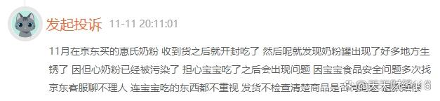 還有一位消費者投訴稱,2023年11月在京東買的恵氏奶粉,收到貨之后就開封吃了,然后發(fā)現(xiàn)奶粉罐好多地方生銹了,該消費者要求退款賠償。