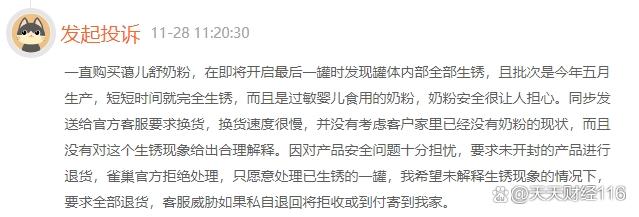 另外一位消費者2023年11月28日投訴稱,其一直購買雀巢藹兒舒奶粉,在即將開啟最后一罐時發(fā)現(xiàn)罐體內部全部生銹,且批次是今年五月生產,短短時間就完全生銹,而且是過敏嬰兒食用的奶粉,奶粉安全很讓人擔心。消費者發(fā)送給官方客服要求換貨,換貨速度很慢,并沒有考慮客戶家里已經沒有奶粉的現(xiàn)狀,而且沒有對這個生銹現(xiàn)象給出合理解釋。
