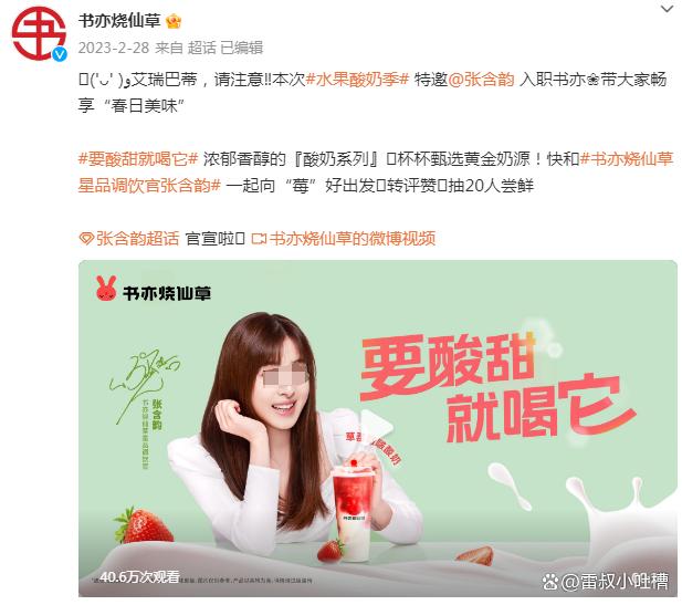 當時為了重磅推出以“草莓啵啵酸奶”為主打的#水果酸奶季#系列產品,書亦燒仙草還專門邀請到“酸酸甜甜女孩”張含韻來代言。