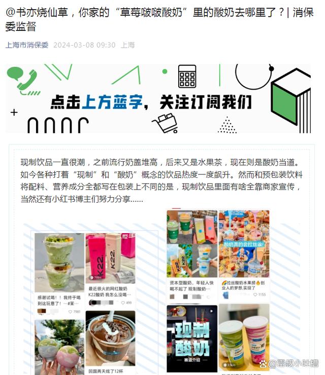 今年3月8日,上海市消保委在微信公眾號,對書亦燒仙草的“草莓啵啵酸奶”提出了質疑。
