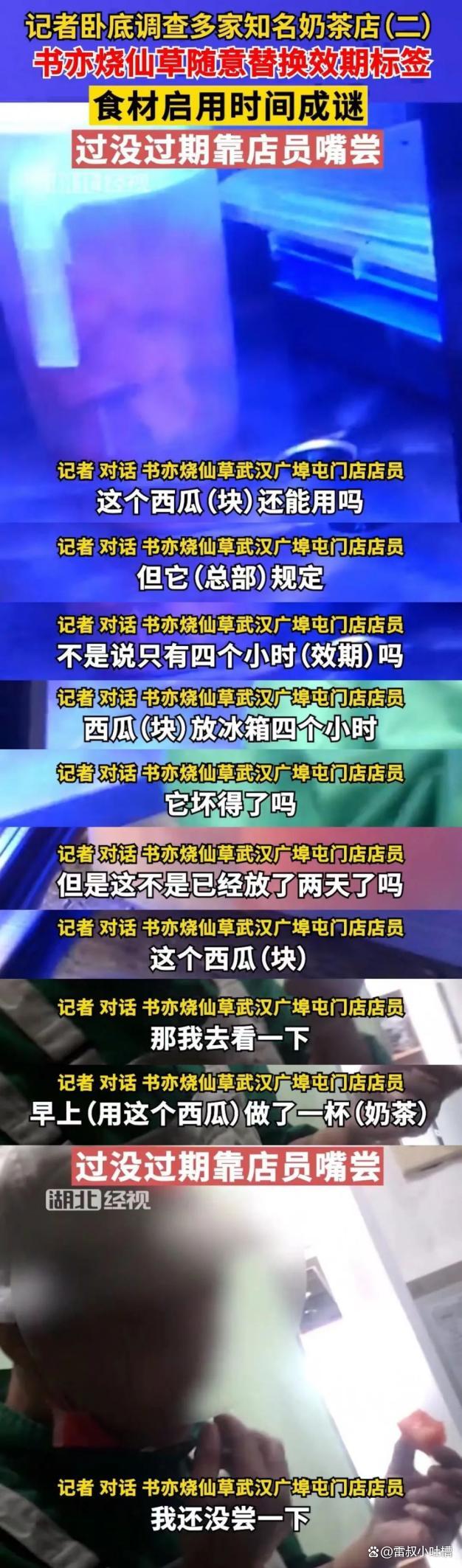 據《315我們在行動》,在書亦燒仙草武漢廣埠屯門店臥底期間,記者被安排上晚班。臨近下班前,店長讓記者檢查門店內所有解凍的、開封的以及煮制的食材效期標簽到期情況。