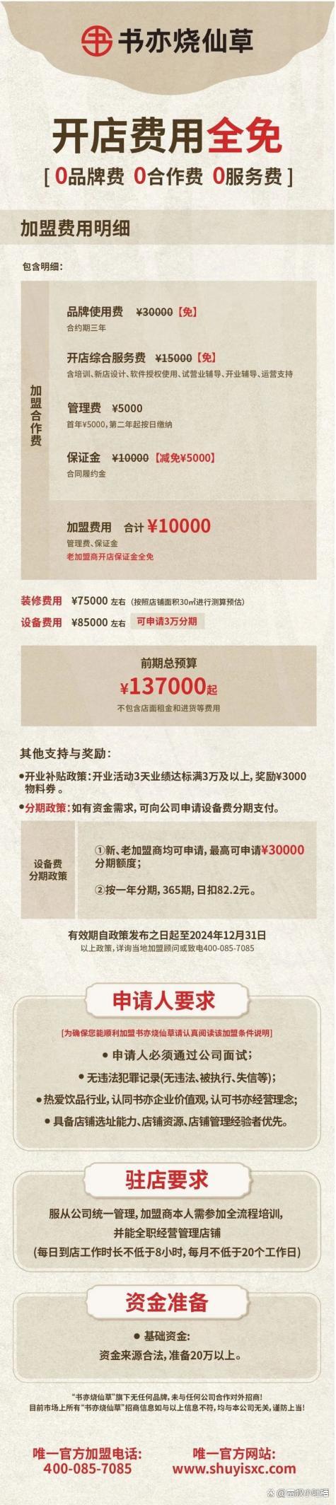 或許是發(fā)現了自己的窘況,書亦燒仙草新的加盟政策開出了0品牌費0合作費0服務費的優(yōu)惠,城市店的加盟開店前期總預算從19萬元降至13.7萬元。