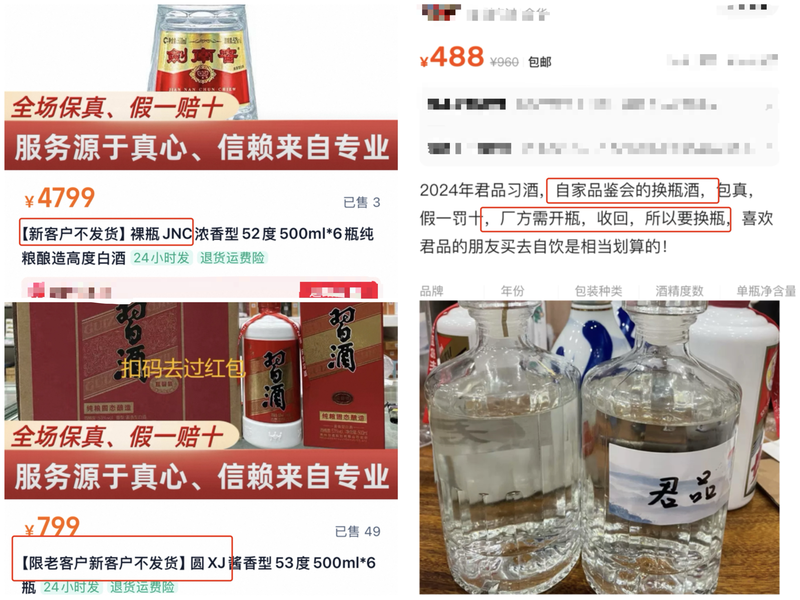 近期,消費(fèi)者史先生在線上平臺(tái)部分店鋪看到售賣標(biāo)注開蓋酒、換瓶酒、裸瓶酒等產(chǎn)品,當(dāng)他出于好奇點(diǎn)開鏈接后,發(fā)現(xiàn)相關(guān)產(chǎn)品備注“只發(fā)老客戶”。