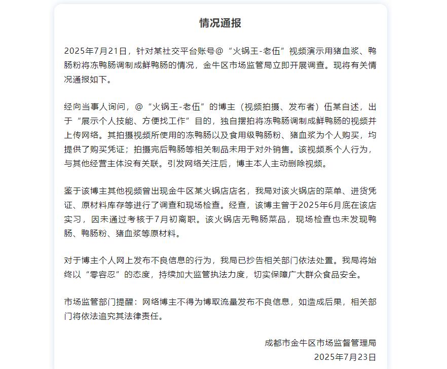 鑒于該博主其他視頻曾出現(xiàn)金牛區(qū)某火鍋店店名,我局對該火鍋店的菜單、進(jìn)貨憑證、原材料庫存等進(jìn)行了調(diào)查和現(xiàn)場檢查。經(jīng)查,該博主曾于2025年6月底在該店實習(xí),因未通過考核于7月初離職。該火鍋店無鴨腸菜品,現(xiàn)場檢查也未發(fā)現(xiàn)鴨腸、鴨腸粉、豬血漿等原材料。