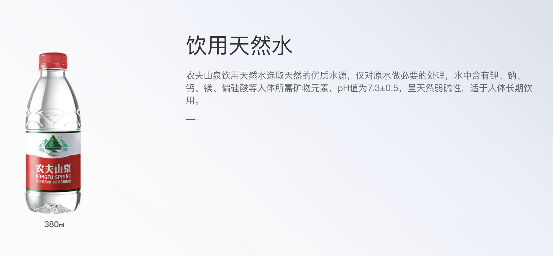 農(nóng)夫山泉這一標準想要強調(diào)的是,對比其他包裝飲用水,農(nóng)夫的含有更多礦物元素。農(nóng)夫山泉在其天然水產(chǎn)品介紹頁面也著重強調(diào),其僅對原水做必要的處理,水中含有鉀、鈣、鈉、鎂、偏硅酸等人體所需礦物元素。