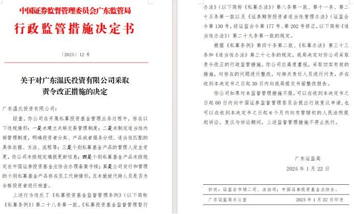 今年1月22日,溫氏股份旗下子公司廣東溫氏投資有限公司收到了中國證監(jiān)會廣東監(jiān)管局的行政監(jiān)管措施決定書,該公司在開展私募投資基金管理業(yè)務(wù)過程中,存在多項違規(guī)情形。
