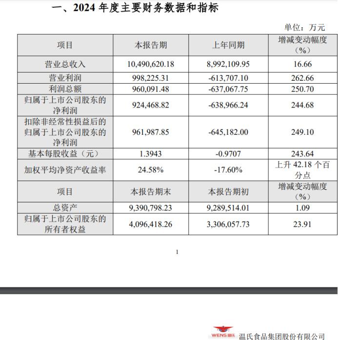 據(jù)其2月20日發(fā)布的2024年業(yè)績快報顯示,去年溫氏股份實現(xiàn)營業(yè)總收入為 1049.06 億元,歸屬于上市公司股東的凈利潤為 92.45 億元,歸母凈利潤同比上升 244.68%。營收、利潤同比大幅增長的最主要原因還是在于豬賣得多了,豬肉漲價了。