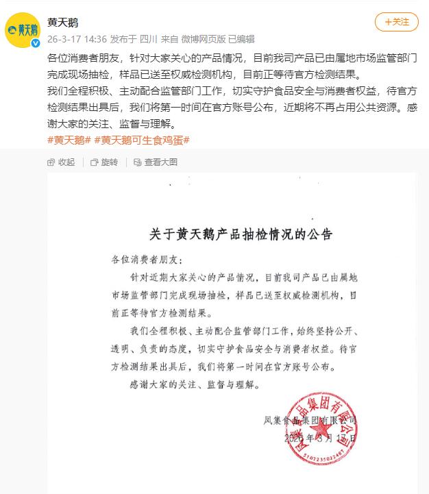 3月17日,黃天鵝微博發(fā)公告稱,目前公司產(chǎn)品已由屬地市場(chǎng)監(jiān)管部門完成現(xiàn)場(chǎng)抽檢,樣品已送至權(quán)威檢測(cè)機(jī)構(gòu);待官方檢測(cè)結(jié)果出具后,公司將第一時(shí)間在官方賬號(hào)公布,近期將不再占用公共資源。