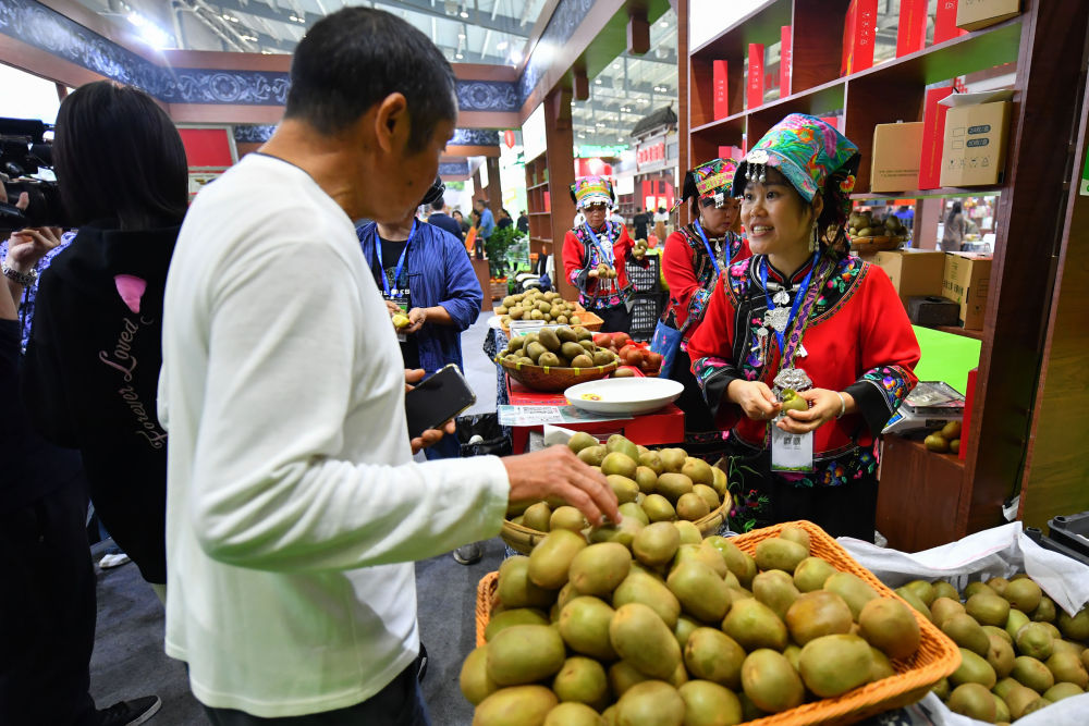在農(nóng)博會(huì)現(xiàn)場(chǎng),湘西蔬果展區(qū)的參展商向參觀者介紹獼猴桃。 新華社記者 陳澤國(guó) 攝