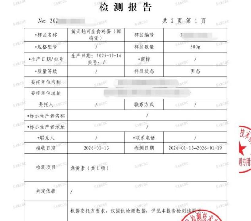 相關(guān)檢測(cè)結(jié)果來自王海團(tuán)隊(duì)委托第三方具備法定資質(zhì)的檢測(cè)機(jī)構(gòu)開展的檢測(cè)。數(shù)據(jù)顯示,首批送檢的黃天鵝可生食雞蛋角黃素實(shí)測(cè)值為0.399mg/kg。