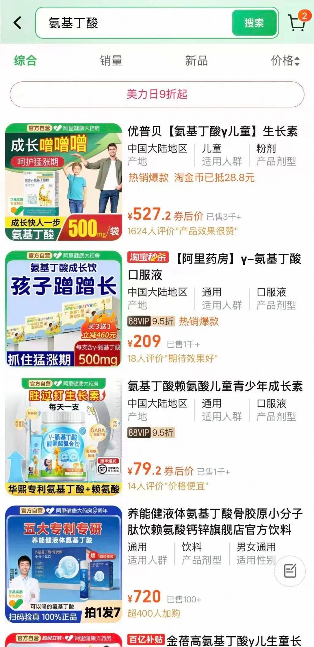 在淘寶店鋪阿里健康大藥房更是“重災(zāi)區(qū)”,該店鋪上架添加“γ-氨基丁酸”的產(chǎn)品,超過十款貼有明顯與“促進身高發(fā)育”的標(biāo)語。比如,宣稱“個子噌噌長”“勝過打生長素”“不做矮小孩”等。