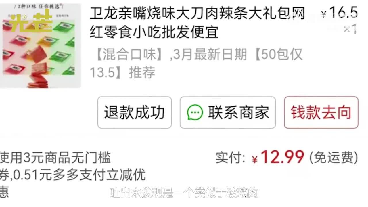 4月20日,湖北荊州,陳女士爆料稱4月4日在衛(wèi)龍辣條里吃出硬物,一塊類似于玻璃塑膠的透明狀晶體,當時還嚼了兩下,發(fā)現(xiàn)確實硬物趕緊吐了出來,幸好沒吃到肚子里。隨后在消協(xié)平臺投訴,12日,有自稱衛(wèi)龍廠商的工作人員聯(lián)系,提出賠償30元錢的解決方案遭到陳女士拒絕,陳女士稱希望查廠家清楚這塊硬物來自哪里,是什么材質。陳女士稱廠家之后就再無聯(lián)系,并拒不賠付,拒不理睬。