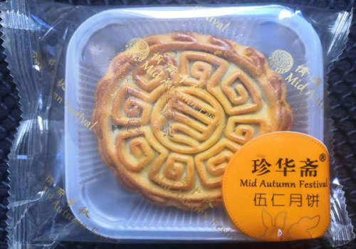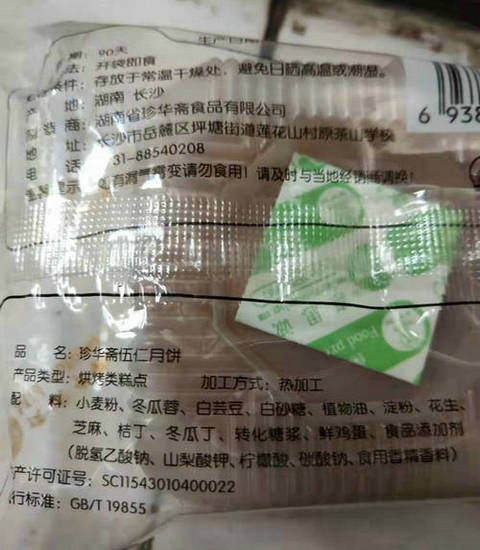 在陳先生出示的一塊“珍華齋”伍仁月餅的產(chǎn)品標簽上,記者看到,該產(chǎn)品的名稱為珍華齋伍仁月餅,生產(chǎn)企業(yè)為湖南珍華齋食品有限公司,生產(chǎn)地址為長沙市岳麓區(qū)坪塘街道蓮花山村原茶山學(xué)校,產(chǎn)品執(zhí)行標準為GB/T19855,配料為小麥粉、冬瓜蓉、白蕓豆、白沙糖、植物油、淀粉、花生、芝麻、桔丁、冬瓜丁、轉(zhuǎn)化糖漿、鮮雞蛋、食品添加劑(脫氫乙酸鈉、山梨酸鉀、檸檬酸、碳酸鈉、食用香精香料)。