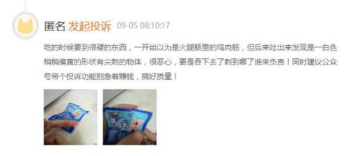 再如,2021年9月5日,一位消費(fèi)者投訴稱,鹽津鋪?zhàn)用阅阈∪鈼椫谐霈F(xiàn)異物。“吃的時(shí)候要(咬)到很硬的東西,一開始以為是火腿腸里的雞肉筋,但后來(lái)吐出來(lái)發(fā)現(xiàn)是一白色稍稍偏黃的形狀有尖刺的物體,很惡心,要是吞下去了刺到哪了誰(shuí)來(lái)負(fù)責(zé)!同時(shí)建議公眾號(hào)帶個(gè)投訴功能別急著賺錢,搞好質(zhì)量!”