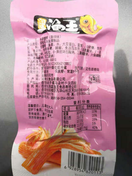 汪先生購買的洞庭漁王牌手撕蟹柳的產(chǎn)品標(biāo)簽上顯示,該產(chǎn)品的配料為:仿蟹柳(魚糜、水、大豆蛋白、蛋清)、白砂糖、食用鹽、香辛料、食用香精、辣椒、食品添加劑(谷氨酸鈉、5′-呈味核苷酸二鈉、卡拉膠、D-異抗壞血酸鈉、三聚磷酸鈉、六偏磷酸鈉、焦磷酸鈉、雙乙酸鈉);產(chǎn)品類型為即食風(fēng)味魚糜制品;食用方法為開袋即食;委托生產(chǎn)商為岳陽市東洞庭漁王食品有限公司;生產(chǎn)商為湖南大成食品有限公司。