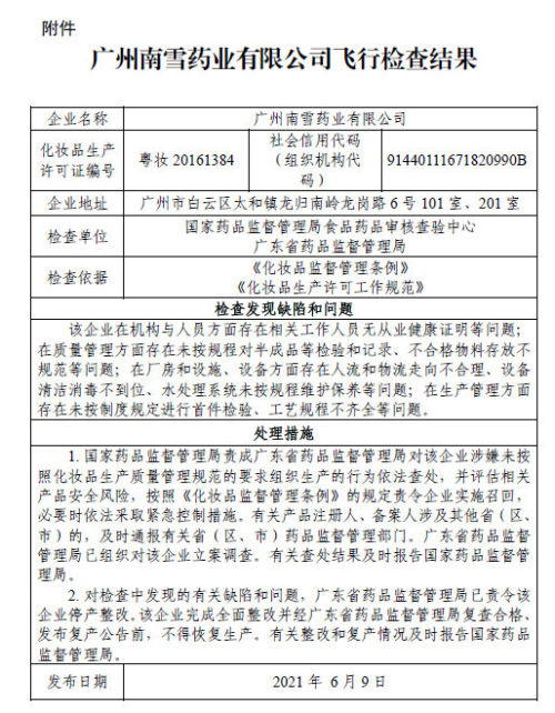 一波未平,一波又起。6月11日,國(guó)家藥品監(jiān)督管理局發(fā)布關(guān)于廣州南雪藥業(yè)有限公司飛行檢查結(jié)果的通告,由于該企業(yè)違反了《化妝品監(jiān)督管理?xiàng)l例》、《化妝品生產(chǎn)許可工作規(guī)范》等有關(guān)規(guī)定,該局已責(zé)成廣東省藥品監(jiān)督管理局責(zé)令該企業(yè)停產(chǎn)整改,并對(duì)該企業(yè)立案調(diào)查。